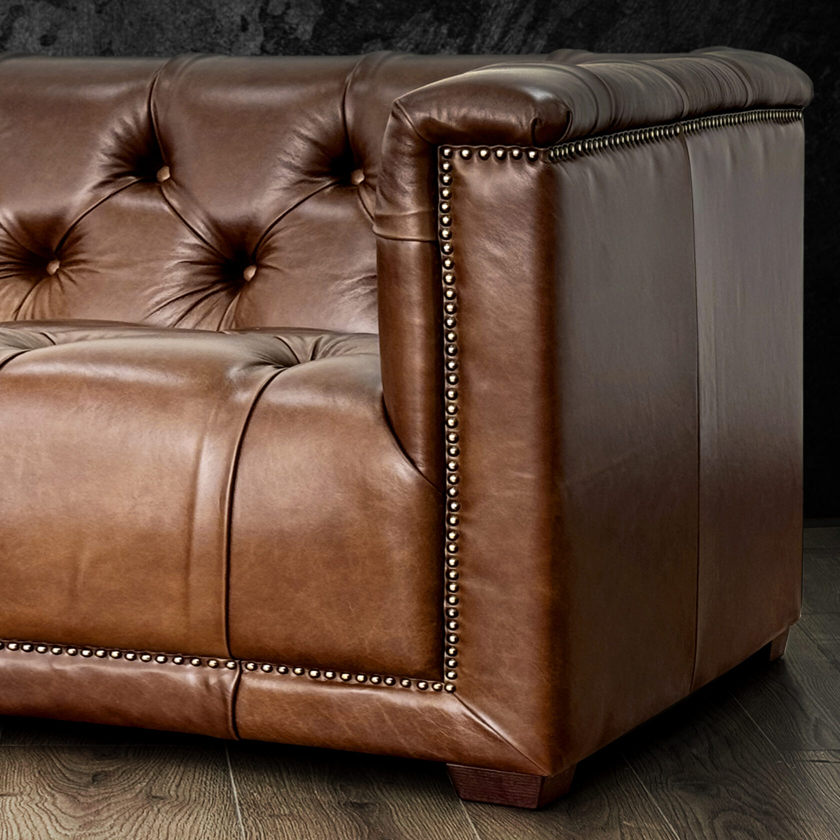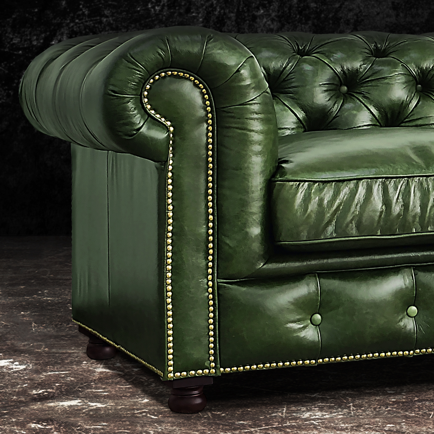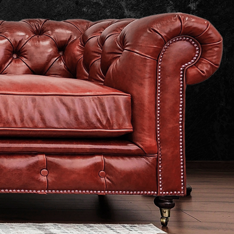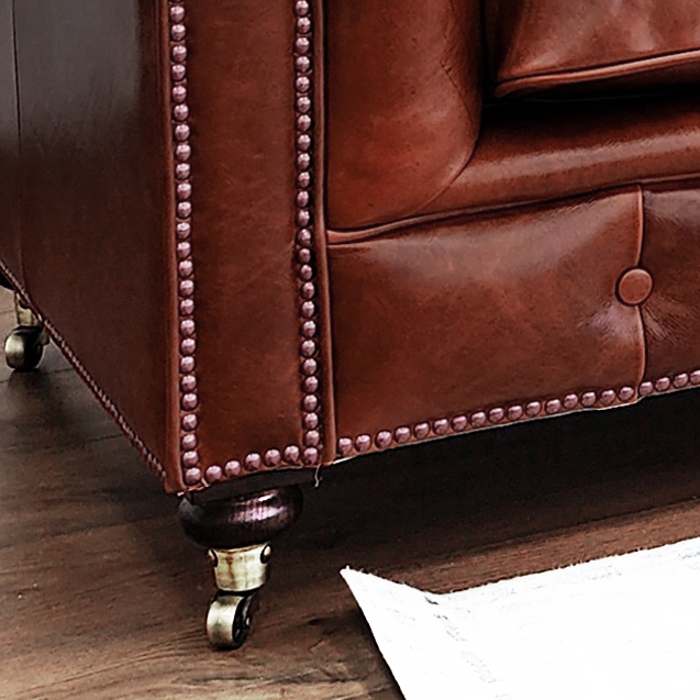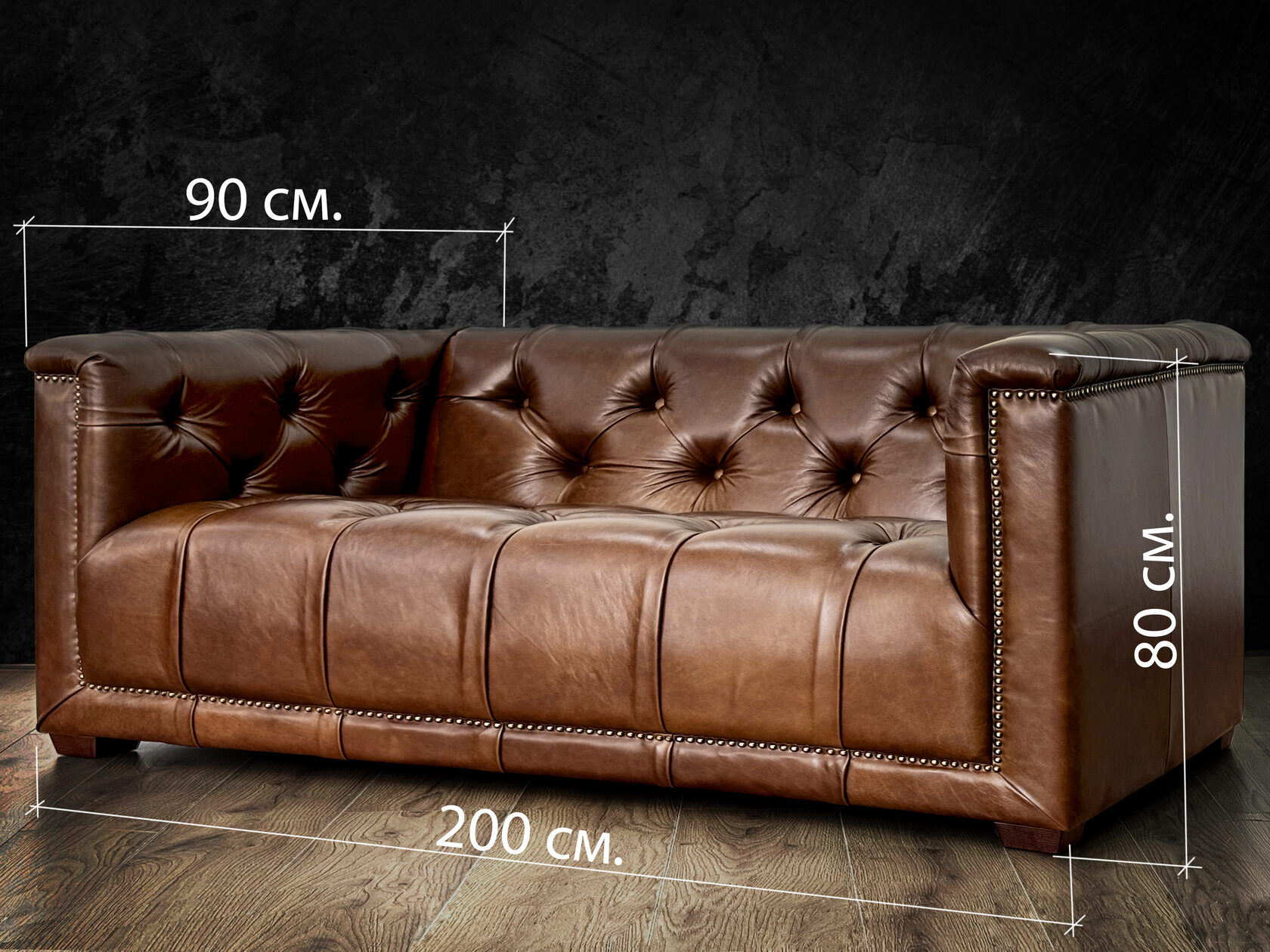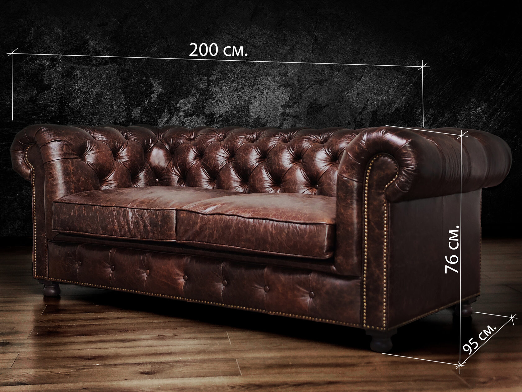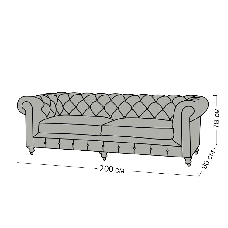 Габаритные размеры: Ш/Г/В 220х95х75 см. Размер посадочного места: 140х65 см. Высота сиденья: 45 см. Высота ножек: 12 см. Ножки: массив бука, цвет - Орех тёмный. Декоративные гвозди: Цвет - Old Gold; поштучно; Производство - Италия. Механизм трансформации: не предусмотрен Материал каркаса: березовая шлифованная фанера сорта 3/4, хвойный брус. Мягкое наполнение: В сиденье высокоплотный ППУ (поролон) топовых марок HR и EHR. В качестве упругого основания под подушками служит пружина змейка.
