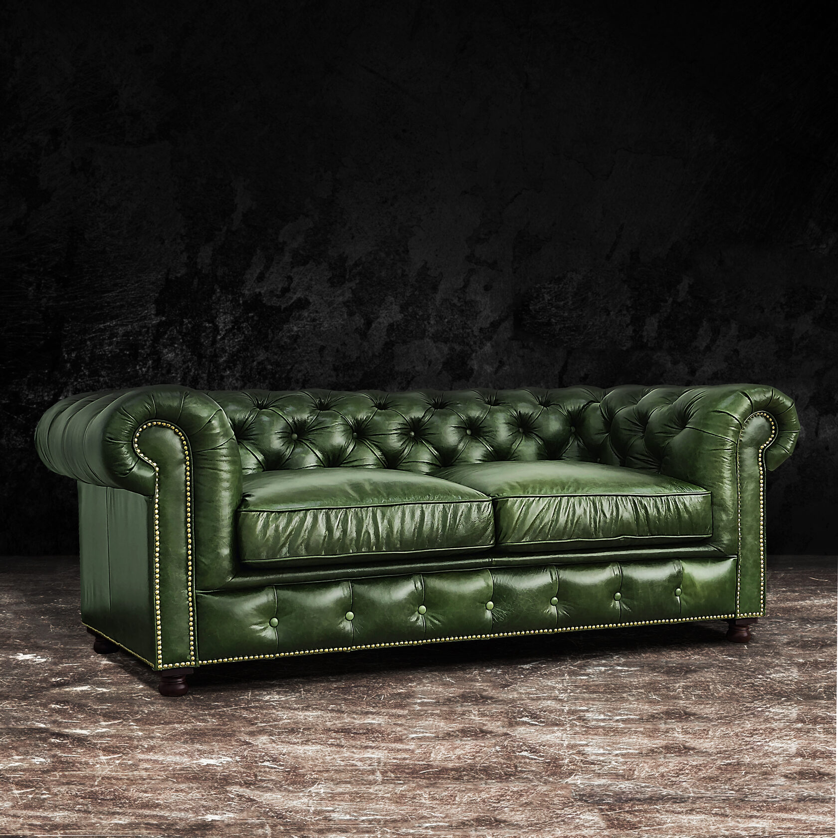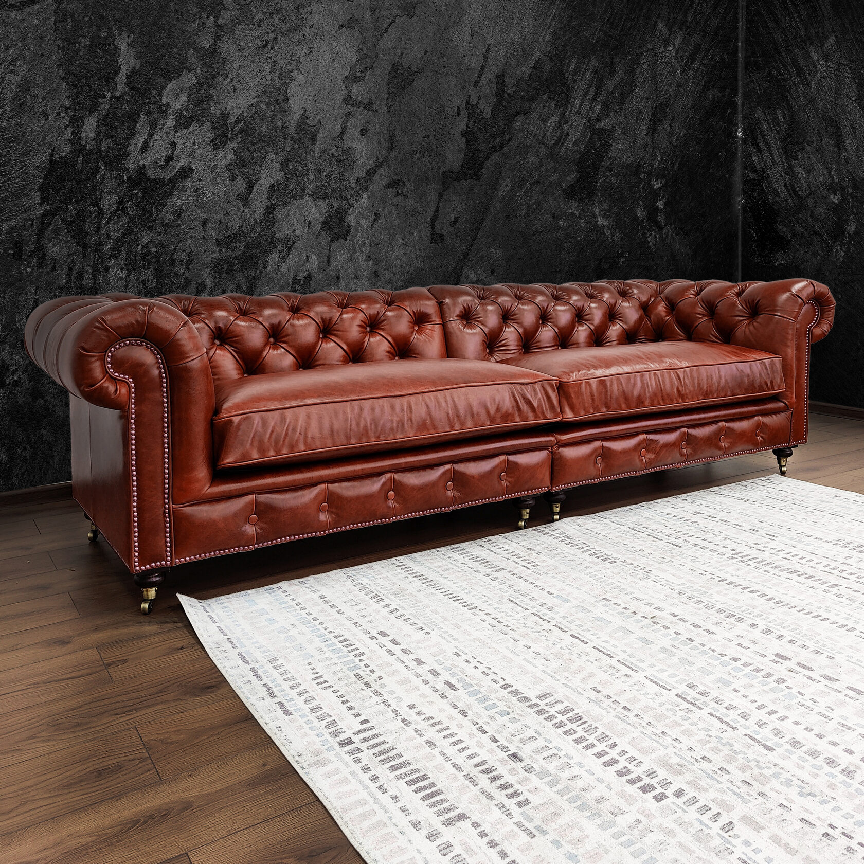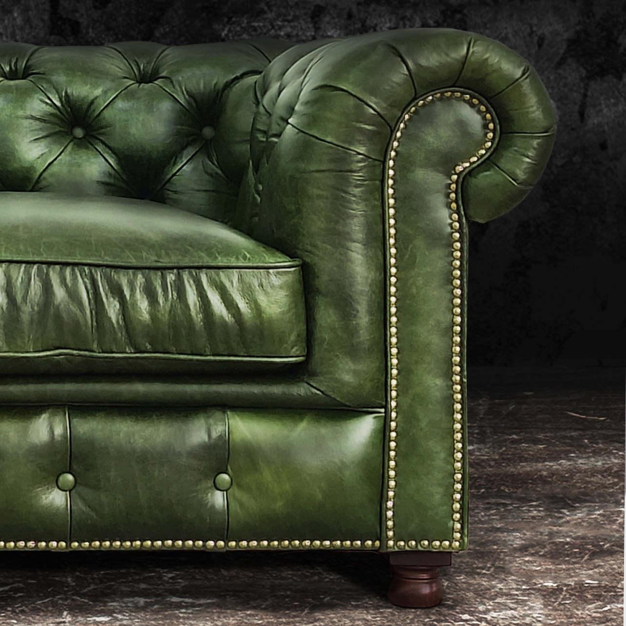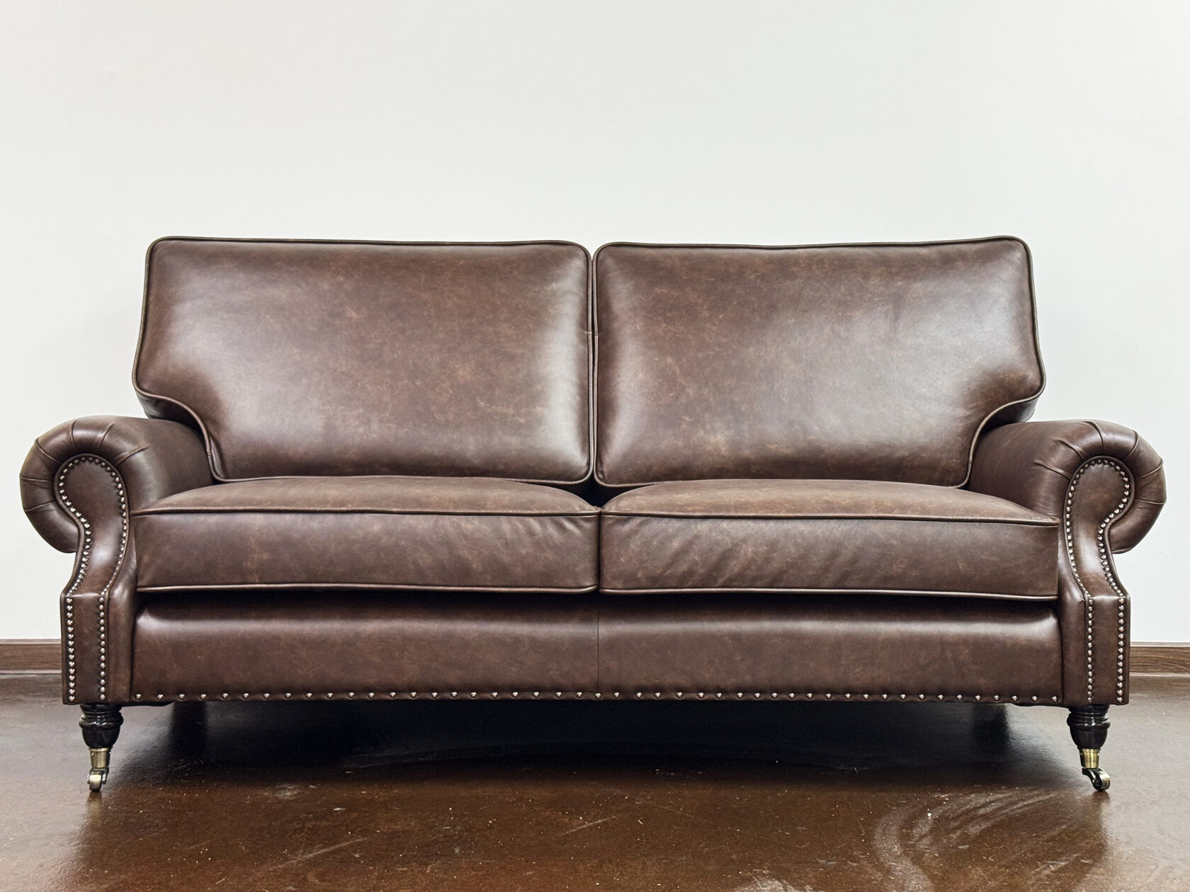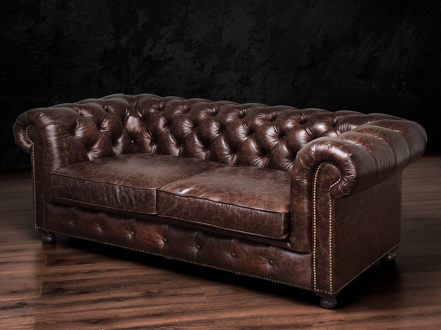 Габаритные размеры: Ш/Г/В 220х95х75 см. Размер посадочного места: 140х65 см. Высота сиденья: 45 см. Высота ножек: 12 см. Ножки: массив бука, цвет - Орех тёмный. Декоративные гвозди: Цвет - Old Gold; поштучно; Производство - Италия. Механизм трансформации: не предусмотрен Материал каркаса: березовая шлифованная фанера сорта 3/4, хвойный брус. Мягкое наполнение: В сиденье высокоплотный ППУ (поролон) топовых марок HR и EHR. В качестве упругого основания под подушками служит пружина змейка.