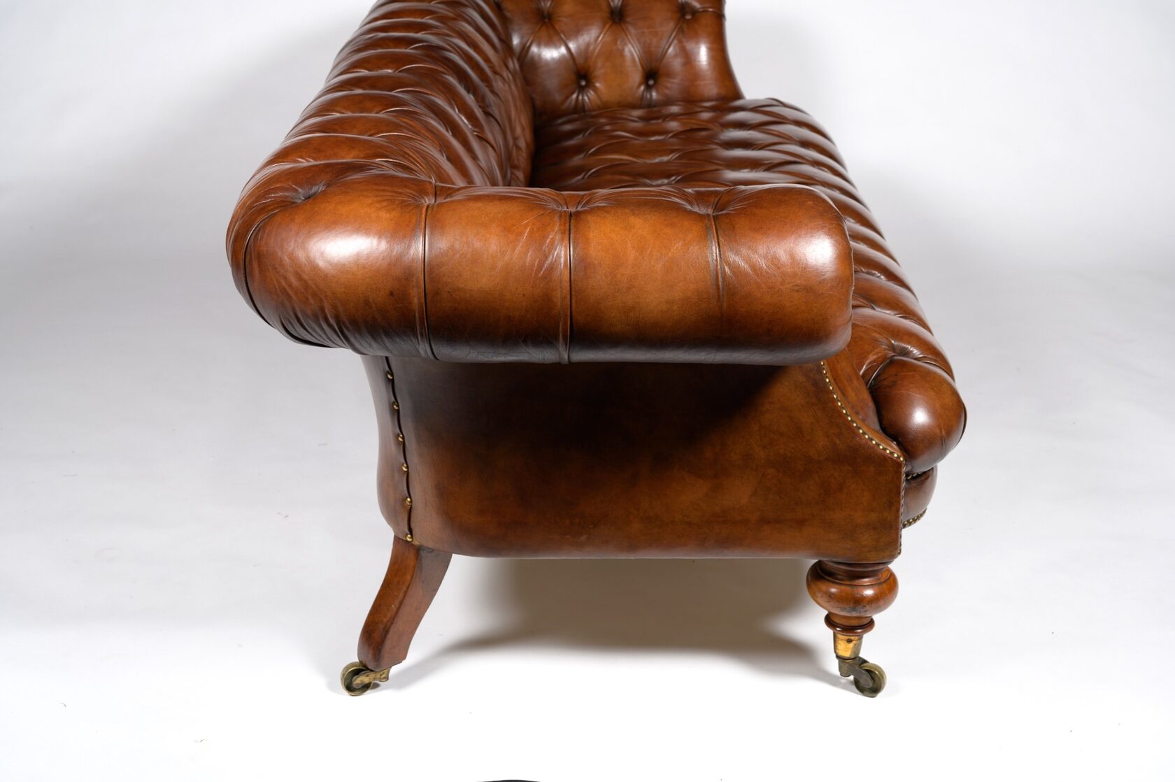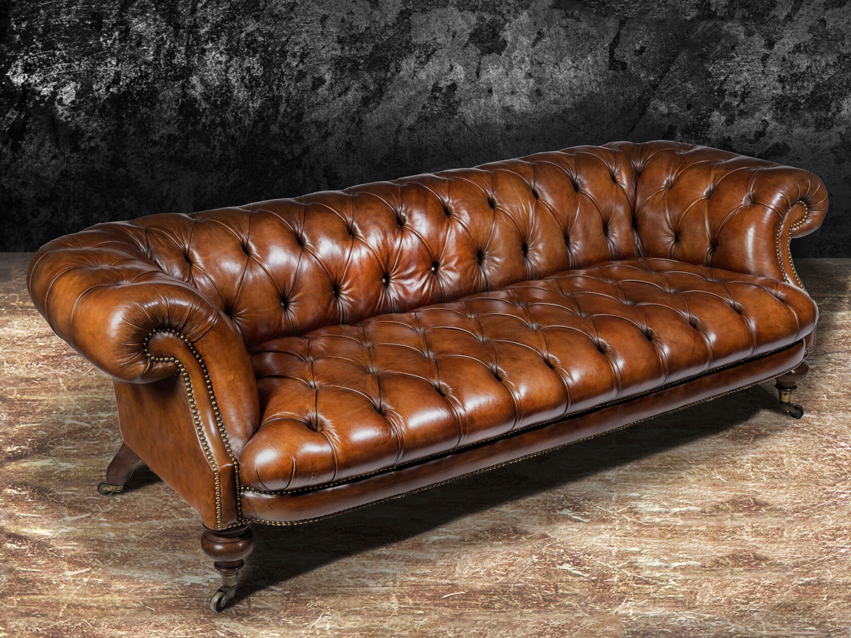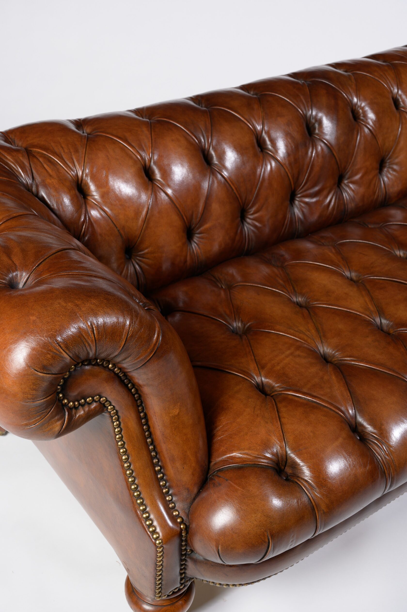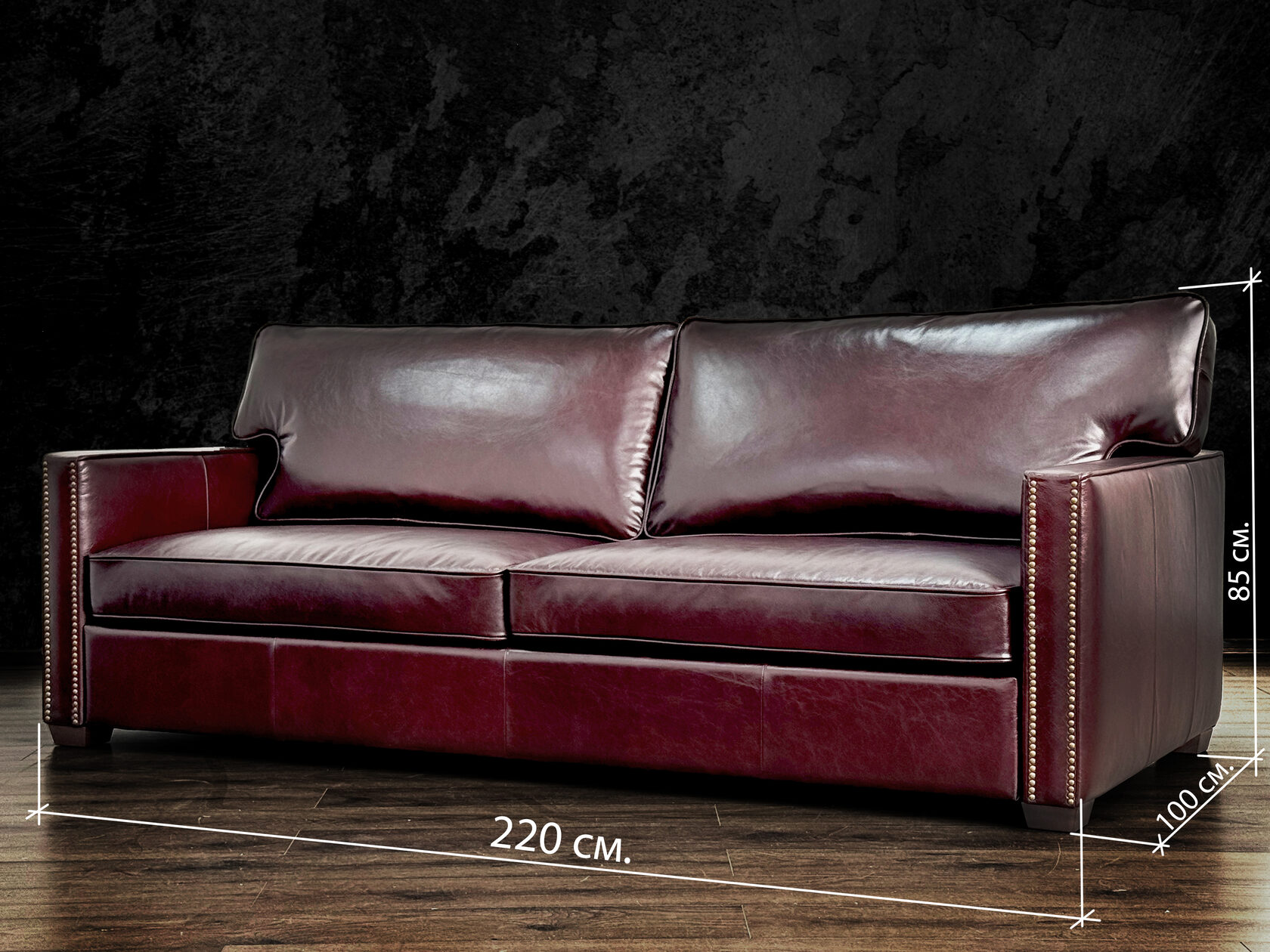 Габаритные размеры: Ш/Г/В 220х100х85 см. Размер посадочного места: 200х65 см. Высота сиденья: 50 см. Высота ножек: 5 см./ 7 см. Ножки: массив бука, цвет - Вишня. Декоративные гвозди: Цвет - Old Coppered (старая медь); поштучно; Производство - Италия. Механизм трансформации: Французская раскладушка; Спальное место 160х195 см. Внимание!!! Механизм в указанную стоимость не входит, (+21000 руб.) Материал каркаса: березовая шлифованная фанера сорта 3/4, хвойный брус. Мягкое наполнение: В сиденье высокоплотный ППУ (поролон) топовых марок HR и EHR. В качестве упругого основания под подушками служит пружина змейка.